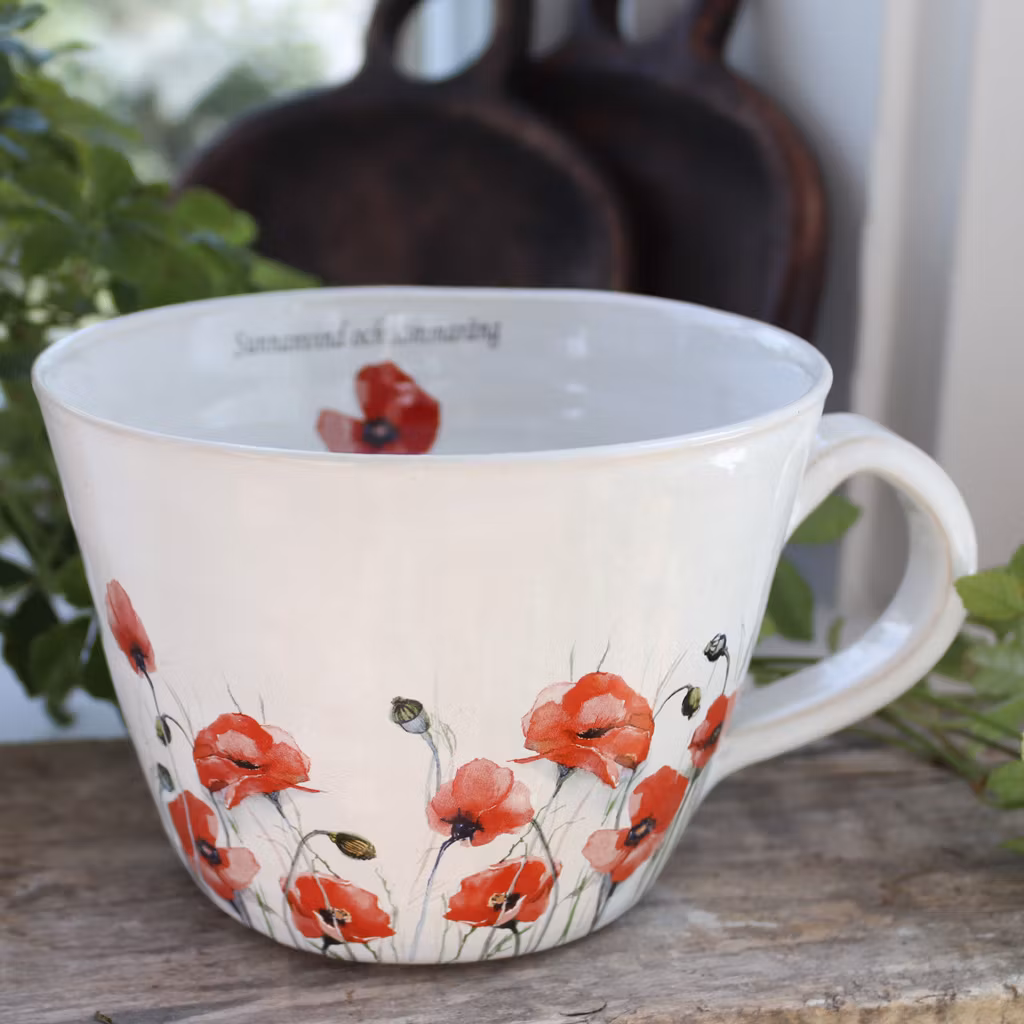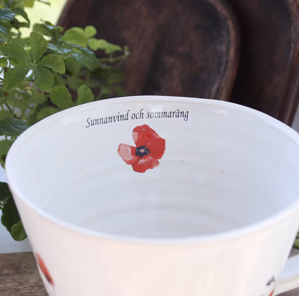 Vacker vit kopp med texten Sunnanvind och sommaräng