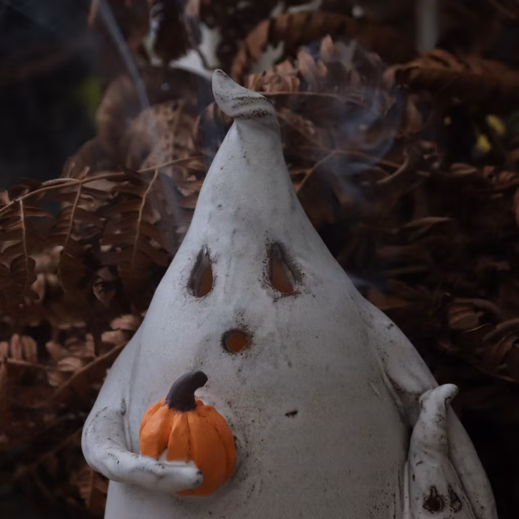 Drejat och handskulpterat spöke med ett litet minispöke och pumpor.